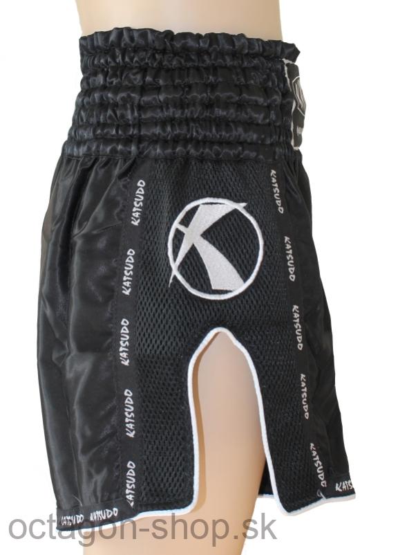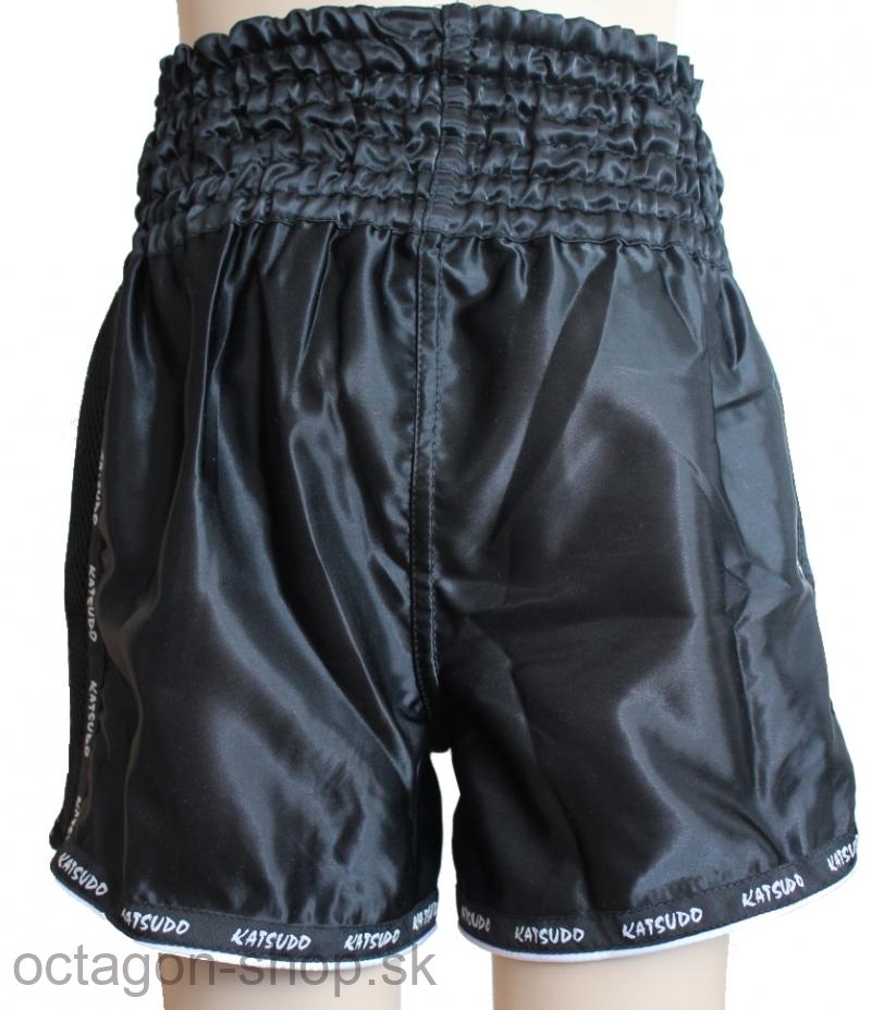 Thai box trenky Huricane su ušité z čierneho saténu (100% polyester) s bielymi aplikáciami (lemovka okolo nohavíc a vyšívané logo po bokoch).